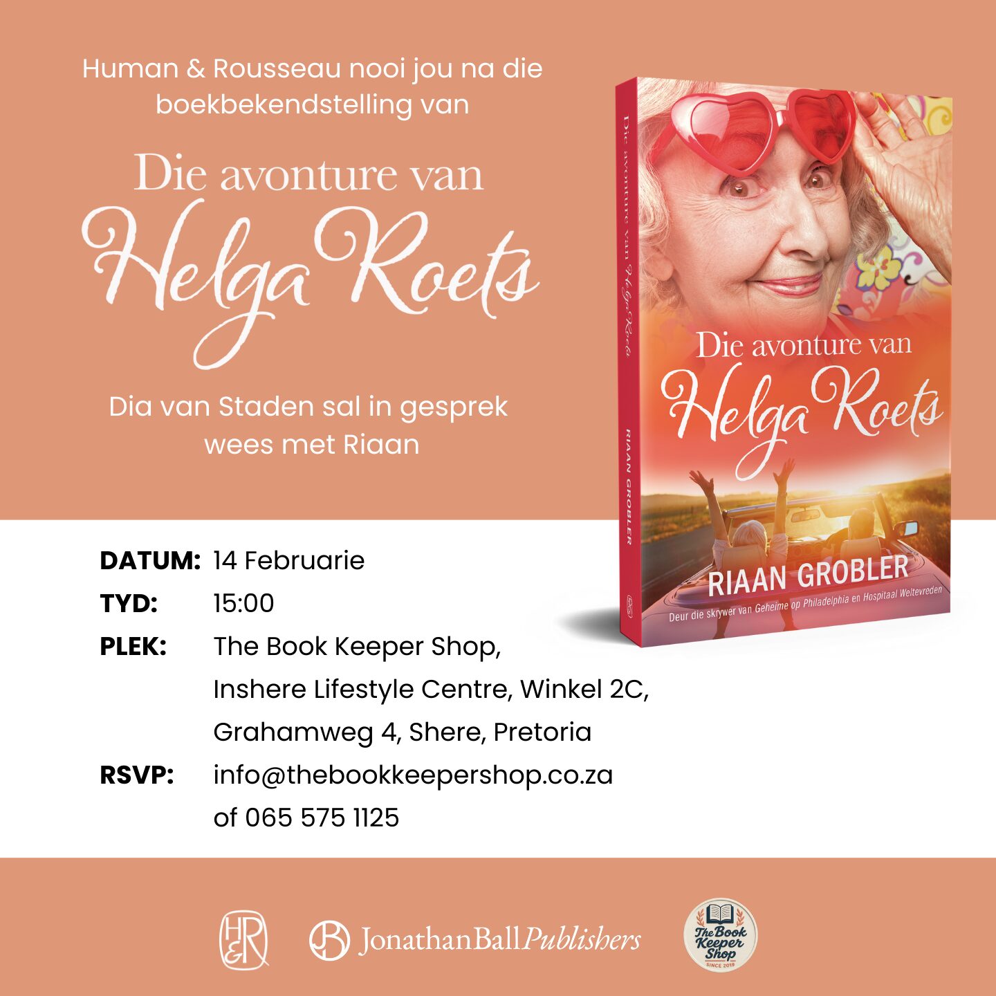 Die avonture van Helga Roets Date Feb 14 2026 Time 3:00 pm - 5:00 pm Location The Book Keeper Shop Pretoria