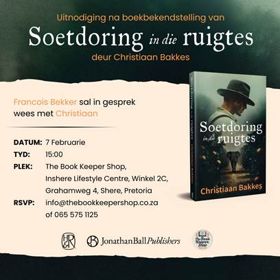 Soetdoring in die ruigtes Date Feb 07 2026 Expired! Time 3:00 pm - 5:00 pm Location The Book Keeper Shop Pretoria